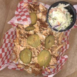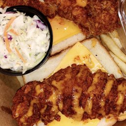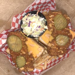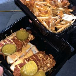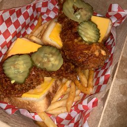 We love hot chicken! And boy do they have yet. We've had mild, medium and hot, and they're all different experiences! Their fried pickles are good! Better fresh than doing take out. Fries aren't bad either. The real winner are their sauces. They're super good and I always use leftovers up with other meals. This location is the only one we've done to and they're so nice! The woman behind the counter was really nice when we waited for our food and was really sweet with my kids. I'd definitely recommend eating here!